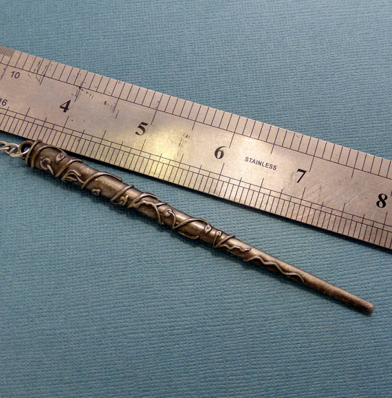ABOUT THE PIECE: The four wands are made from pewter and are 4.5 inches long. Yes, they are really that big. Please keep that in mind while ordering. Harry's wand is placed on a green ribbon, Hermione's is placed on a dark red, Dumbledore's on a light blue, and Voldemort's on a black ribbon.