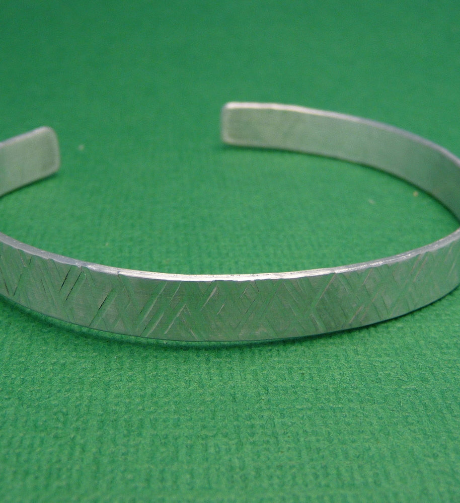 The ¼ inch wide Aluminum cuff bracelet is 6 inches long, and flexible so it can fit on almost any wrist. It's made from 1100 pure Aluminum, which is very safe for your skin. In fact, pure aluminum has a lower rate of skin reaction with Aluminum than there is with Sterling Silver.