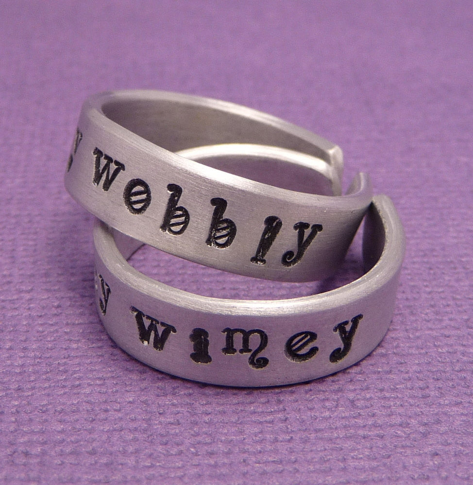 This listing is for a pair of rings stamped with "Wibbly Wobbly" & "Timey Wimey", shown above in my Wonderland Lowercase font - The quote of course comes from the famous Tenth Doctor episode of Doctor Who penned by current Show Runner, Steven Moffat. A great gift for any Doctor Who fan or pair of best friends who are DW fans!