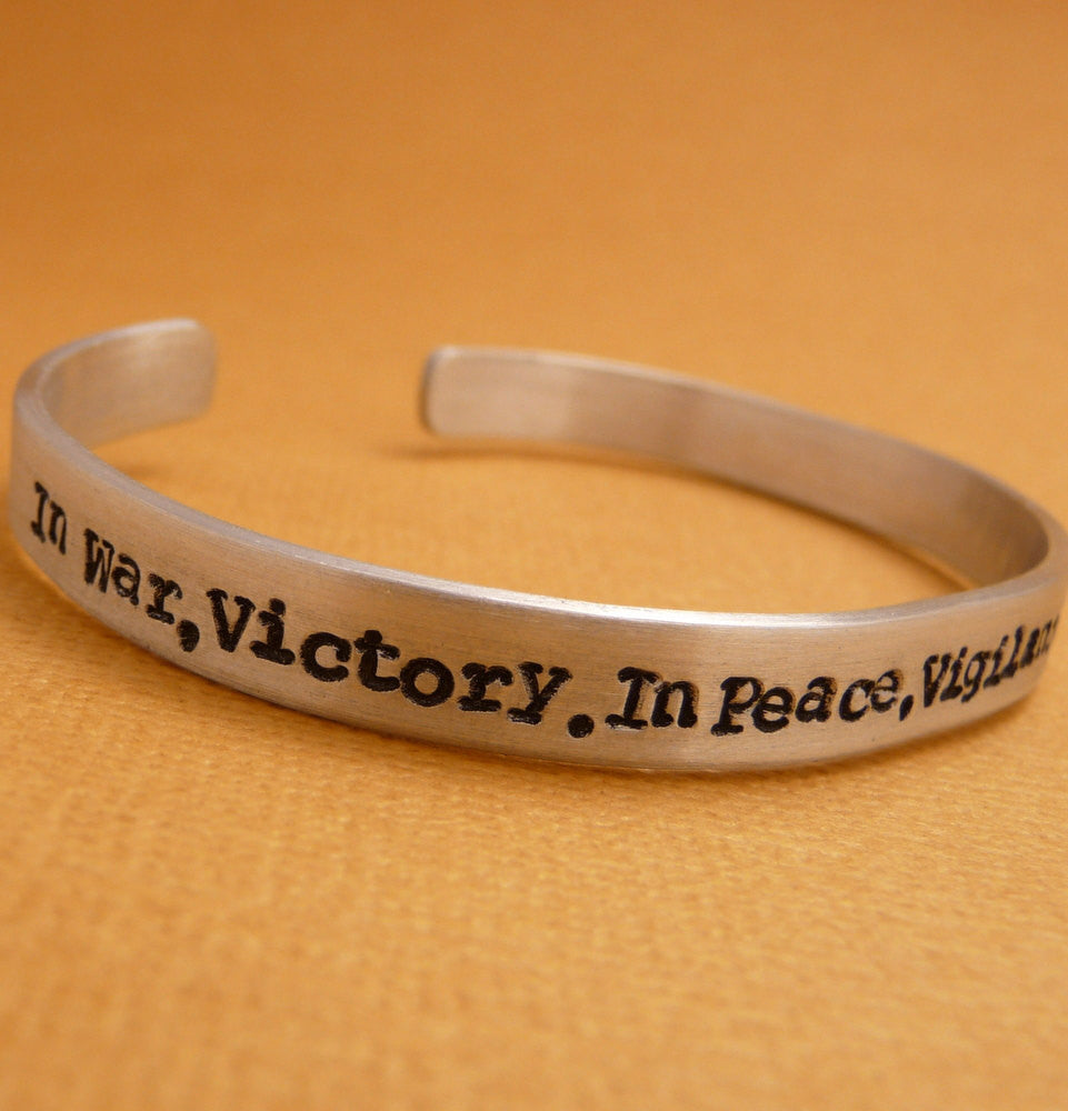 Dragon Age Inspired - In War, Victory. In Peace, Vigilance. In Death, Sacrifice. - A 1/4" Hand Stamped Bracelet in Aluminum or Sterling Silver