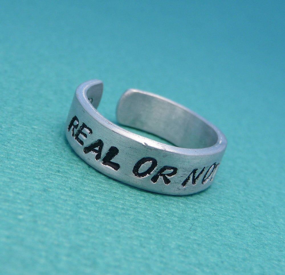 Hunger Games Inspired - Real Or Not Real. Real - A Double Sided Hand Stamped Aluminum Ring