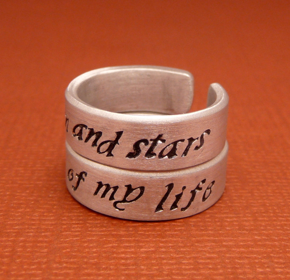 This listing is for ONE ring. Choose your endearment, "My sun and stars" or "Moon of my life" - Daenerys Targaryen & Khal Drogo's pet names for each other in the "A Song of Ice and Fire" series by George R. Martin. Stamped here in my script font. A great gift for any Game of Thrones fan!