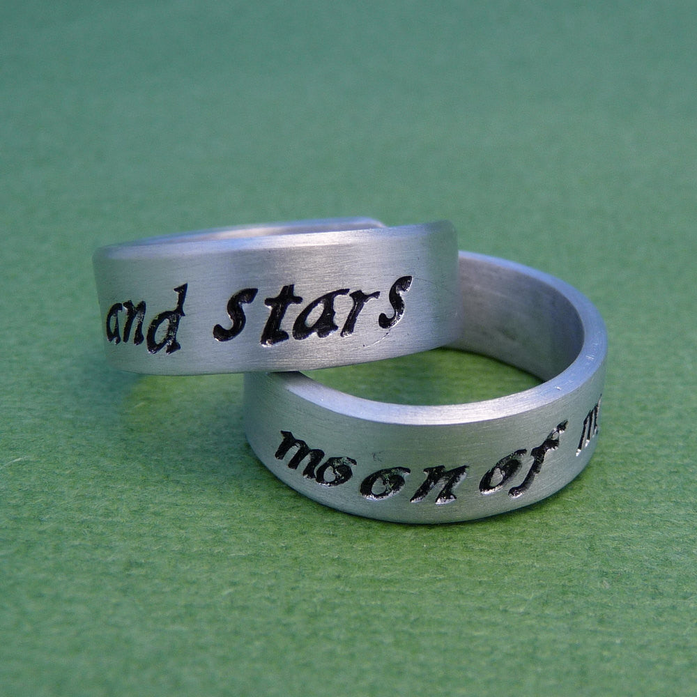 This listing is for a pair of Aluminum rings with "My sun and stars" & "Moon of my life" - Daenerys Targaryen & Khal Drogo's pet names for each other in the "A Song of Ice and Fire" series by George R. Martin. Stamped here in my script font. A great gift for any Game of Thrones fan!