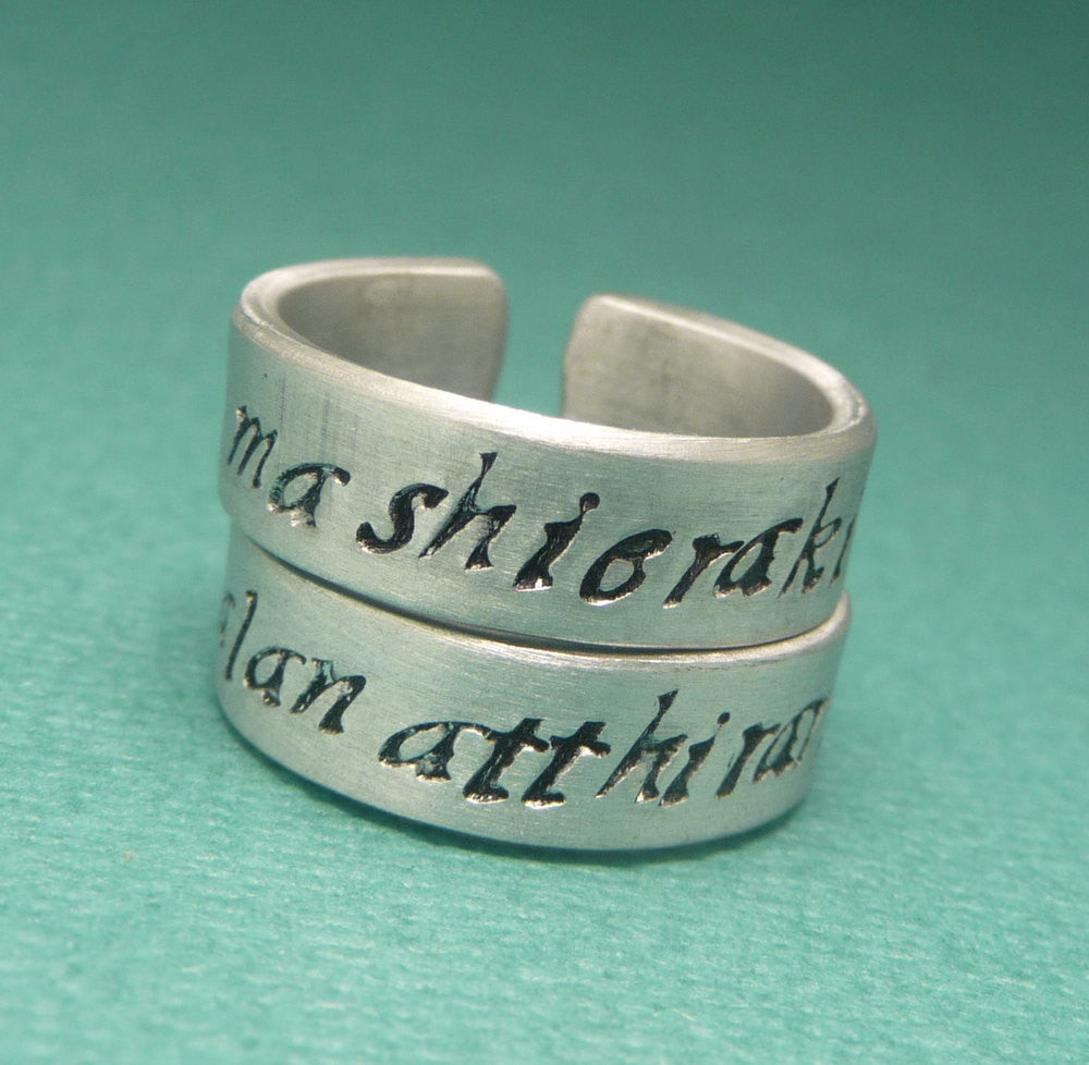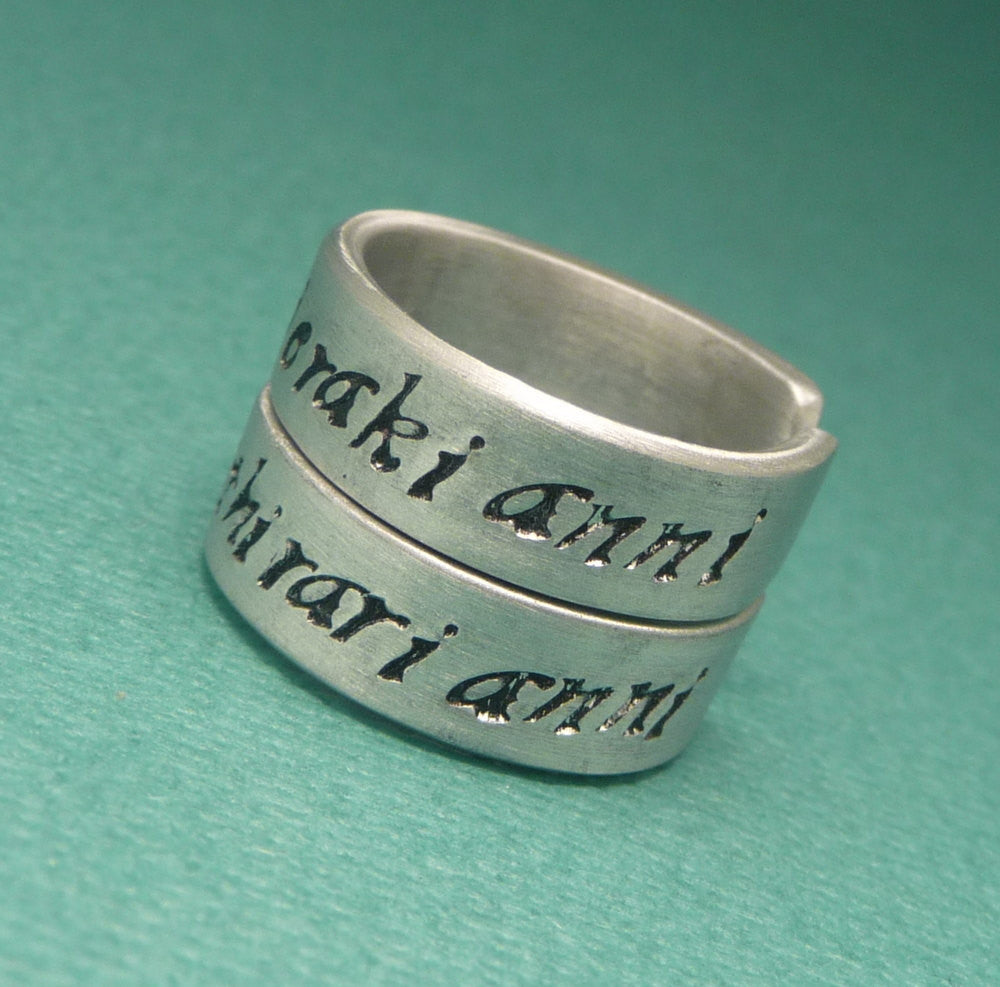 This listing is for a pair of Aluminum rings with "shek ma shieraki anni" & "yer jalan atthirari anni" stamped on them - They're the Dothraki versions of Daenerys Targaryen & Khal Drogo's pet names for each other in the "A Song of Ice and Fire" series by George R. Martin. Stamped here in my script font. A great gift for any Game of Thrones fan!